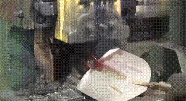 1、制作完成的鋼帶需要進行第一道工序——模具落料。通過工程師精細的計算,制作相應的模具來沖切鋼帶,得到最終成型前所要用的料胚。這樣的模具其實很簡單,通過沖床傳遞的壓力,將料帶沖切成相應的模型。此模具為漏底模。沖切完成后需要將片料進行簡單的沖孔。